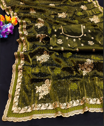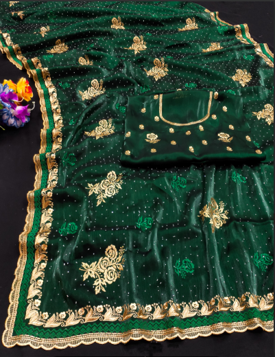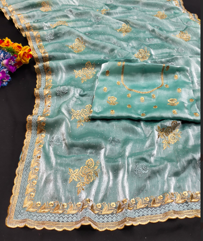 Elevate your ethnic style with this Embroidered Jimmy Choo Saree, crafted in premium fabric known for its soft texture, smooth drape, and luxurious shine. The rich emerald green base is beautifully adorned with golden floral embroidery and sequin accents, making it a perfect pick for weddings, parties, and festive occasions. The saree is enhanced with a golden lace border, adding a touch of royalty, while the matching blouse piece with an embroidered neckline completes the ensemble. Lightweight yet rich in appeal, this Jimmy Choo saree blends comfort with sophistication, making it a timeless addition to your wardrobe.